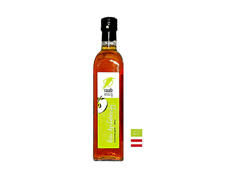 Hier haben wir mit dem mild-fruchtigen Apfelessig, vergoren aus vollreifen Bio-Äpfeln aus dem Eferdinger Becken, einen reinen Gärungsessig mit einem Säuregehalt von 5%.